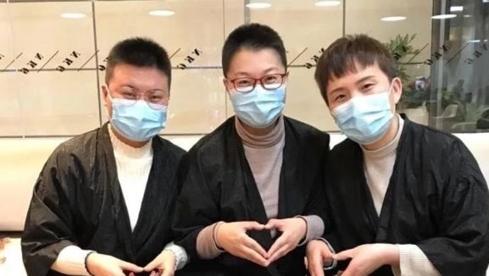 曙光医院理完发的三位战友合影,左起武文文、董春玲(第二批援鄂),林凡菊(第三批援鄂)