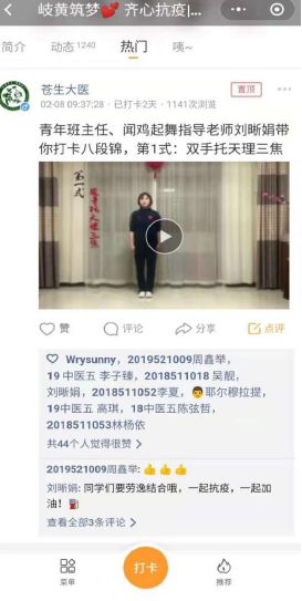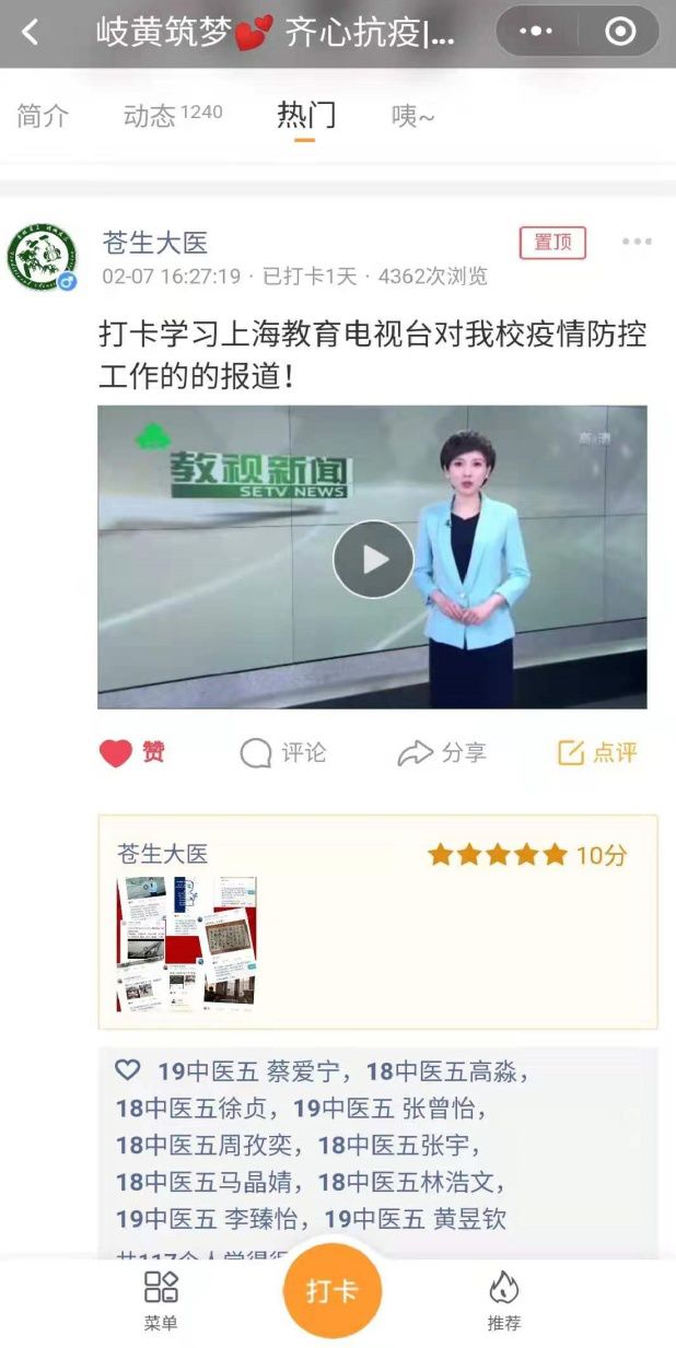 中医理论的“火”有着能快速延展的特点。辅导员通过加强网络思想教育,加强学生网络舆情引导,粉碎谣言,主动占领网络思想政治教育新阵地。基础医学院的辅导员,组织创立“岐黄筑梦•齐心抗疫”打卡圈,吸引了全校540多名师生参与,打卡动态日记1300多篇,内容涉及疫情防控、居家抗疫、志愿奉献、经典学习、功法练习、书法爱好及心理防疫等方面,积极传递正能量,迅速占领网络高地。上海教育电视台对beat365疫情防控工作的报道在学生群体中广泛传播,视频阅读量达到了近4500次。“进圈打卡”正成为一种居家抗疫、共同进步的师生互动教育有效形式。护理学院和康复医学院辅导员通过系列打卡活动,注重信息筛选,潜移默化地传递正确价值观,缓解学生们的焦虑情绪,激发大学生们战胜疫情的信心。