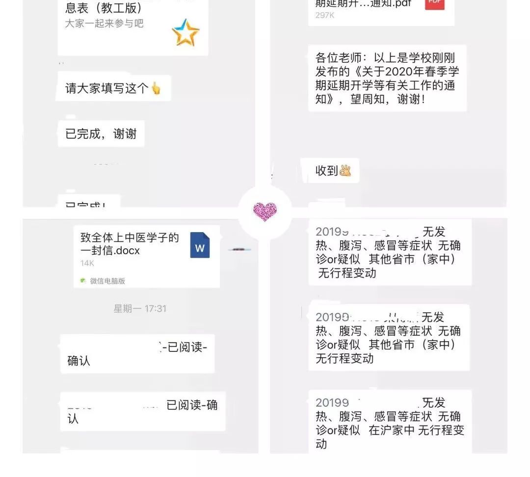 中医理论中,“水”滋养万物、润物无声。辅导员通过心理疏导教育,关注学生的心理健康,加强人文关怀,浸润学生身心,消除恐慌感。面对突如其来的新型冠状病毒感染肺炎的疫情,学生难免会产生恐慌情绪和心理压力,针灸推拿学院辅导员迅速进入“战时”状态,通过微信群、小程序、问卷星等多种方式,组织学生每日报送健康和行程信息,“起床报平安”成为“寒假新风尚”,在学院微信公众号开辟战“疫”特辑,做好学生心理疏导工作,减轻学生的心理负担。面对千余名来自世界各地的国际留学生,“不同国家之间有时差,但上中医的关心没有时差”,国际教育学院的辅导员们开通24小时网络咨询服务,讲好中国抗疫故事,坚定中国抗疫必胜信念。来自马来西亚的校友们发来了“风雨同心 与你同在”的支持视频,伊朗的国际学生易正发来了太极视频,表达了“众志成城,共克时艰”的决心。