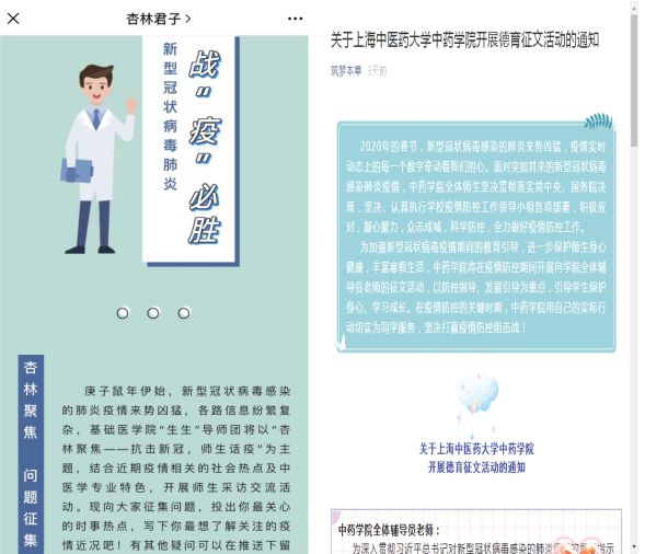 在中医理论中,“木”代表生机。在新型冠状病毒感染肺炎疫情的防控工作中,龙华临床医学院、曙光临床医学院、岳阳临床医学院、普陀临床医学院、市中医临床医学院等附属医院的辅导员充分利用医学技术优势,线上、线下结合,为留校学生宣讲疫情防控知识,赠送口罩等防疫用品。公共健康学院辅导员向学生多维度讲述人与自然要和谐相处,自觉保护野生动物,尊重生命。基础医学院辅导员通过青年班主任线上教学八段锦,以增强学生体质,努力做到关爱学生不断线,师生互动不断线,在落细、落小、落实上下功夫,在关爱学生上出硬招、出实招、出新招。