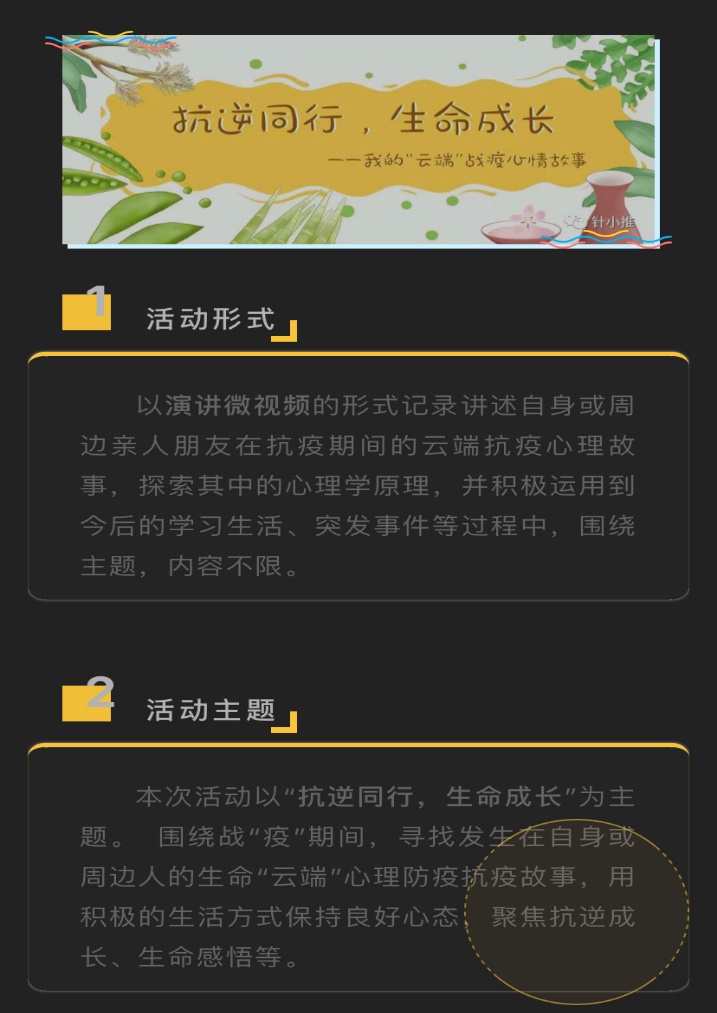 针灸推拿学院导师团开展“抗逆同行,生命成长”微视频征集活动,引领师生抗逆成长,保持良好心态,积极地面对学习生活。
