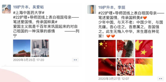 护理学院“护理+”导师团以“笔述爱国情,传承国粹美”为主题,开展线上表白祖国母亲接力活动,鼓励同学们用真挚朴实、饱含深情的文字,在朋友圈积极发声,大声说出对祖国母亲的深厚感情,以培养当代护理学子的“爱国情、强国志、报国行”。