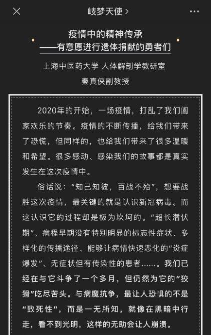 护理学院“护理+”导师团充分挖掘育人元素,以“感恩大体老师”为主题开展生命教育。来自导师团的牟芳芳老师、人体解剖室的秦真侠老师、辅导员张倩倩老师等,写下动人故事,教会学生敬畏生命,学会感恩。