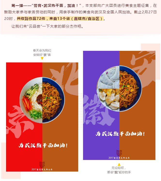 康复医学院导师团发起“武汉热干面,加油!”活动,进行美食主题征集,号召大家积极参与家务劳动,用亲手制作的美食为武汉及全国人民加油。
