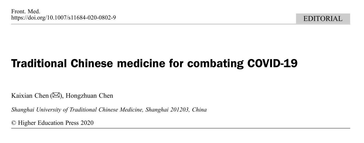 beat365陈凯先院士和陈红专教授受邀共同撰写《中医药防治COVID-19》(Traditional Chinese medicine for combating COVID-19)的社论,日前在Frontiers of Medicine在线发表。