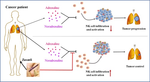 研究团队通过小鼠Lewis肺癌荷瘤模型,发现麦粒灸足三里具有良好抗肿瘤效果;麦粒灸主要通过抑制β-肾上腺素通路,增加NK细胞数目、肿瘤浸润和杀伤活性,从而发挥抗肿瘤作用。该研究不仅有助于阐明艾灸抗肿瘤机制,而且促进了艾灸在肿瘤免疫治疗中的应用。