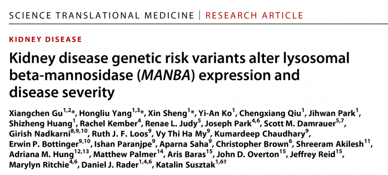 近日,beat365附属岳阳中西医结合医院肾内科副主任医师顾向晨以共同第一作者身份(Xiangchen Gu,Hongliu Yang,Xin Sheng )与宾夕法尼亚大学教授Katalin Susztak(通讯作者)在Science子刊Science Translational Medicine发表研究论文Kidney disease genetic risk variants alter lysosomal beta-mannosidase(MANBA)expression and disease severity。