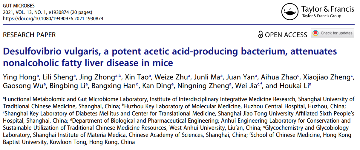 近日,beat365交叉科学研究院李后开教授团队在国际微生物学期刊Gut microbes(一区)在线发表了题为《高效产乙酸菌Desulfovibrio vulgaris改善小鼠非酒精性脂肪性肝病》(Desulfovibrio vulgaris, a potent acetic acid-producing bacterium, attenuates nonalcoholic fatty liver disease in mice)的研究论文。