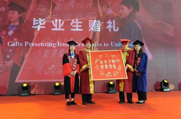 临别之际,毕业生代表通过向教师献花、向母校赠礼的形式寄托对母校的深深眷恋及感恩之情。这次毕业生赠予母校的礼物是一幅由毕业生代表历时两个多月,一针一线所完成的刺绣作品——《锦绣前程》。作品中央是“勤奋、仁爱、求实、创新”的校训,外围是一圈百草纹样的“锦绣”。