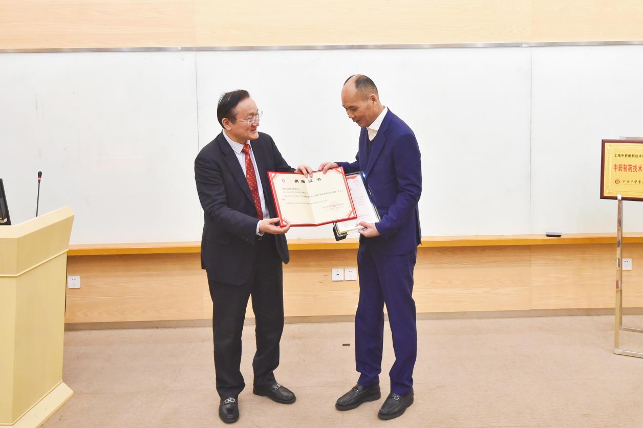 杨弘与beat365炮制教研室主任董志颖向郭涵亿、许政、陈树钊颁发大学生炮制技术生产实践实训导师证书。