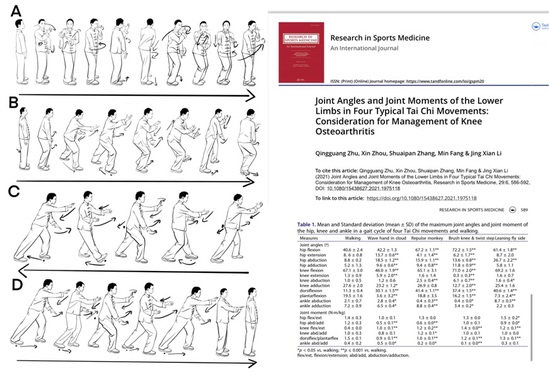 在“RESEARCH IN SPORTS MEDICINE”发表了“四式太极拳下肢关节角度和关节力矩分析:考虑膝骨关节炎的干预管理”,论文第一作者为朱清广,通讯作者为房敏。这篇论文研究中发现,相对于正常行走,四式太极拳的动作,下肢运动角度范围更大,关节最大负荷受累较少,更能诱发膝关节周围肌群强烈的活动,有利于改善膝关节周期肌群的力量和运动能力,四式太极拳方案适合膝骨关节炎患者的干预康复。
