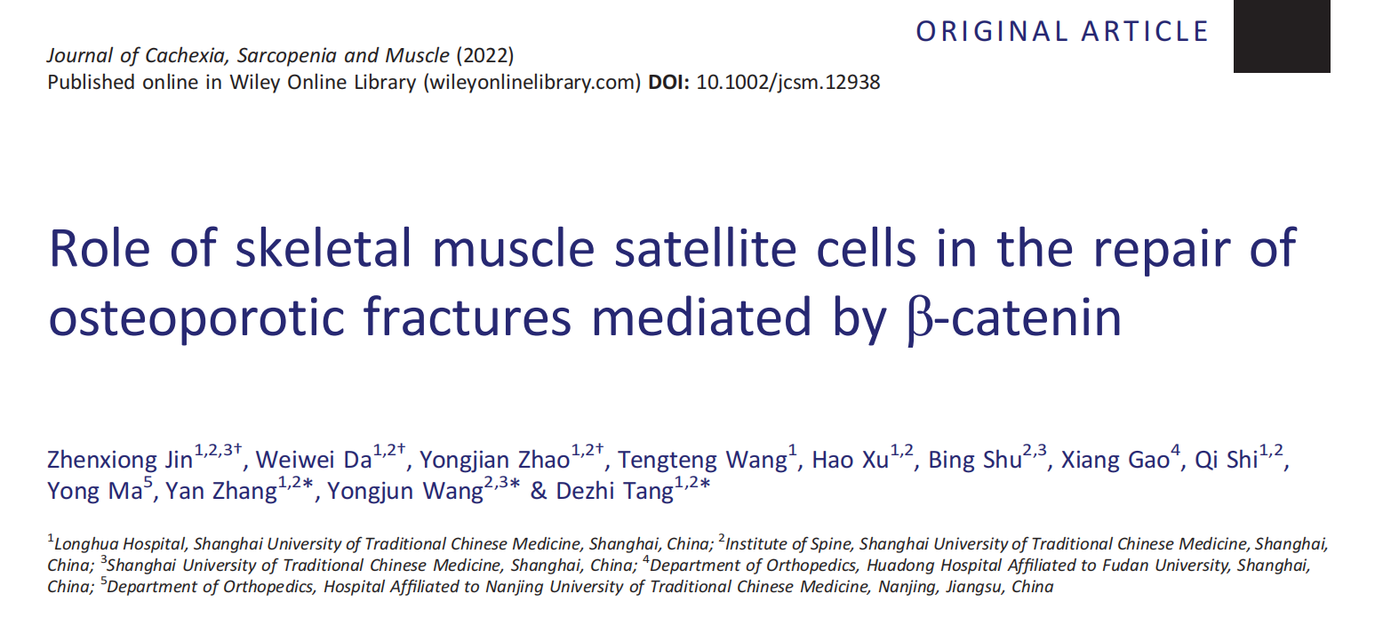 近日,beat365附属龙华医院及脊柱病研究所、教育部筋骨理论与治法重点实验室研究团队在肌肉研究领域国际顶级期刊《恶病质、肌肉减少症和肌肉杂志》(Journal of Cachexia, Sarcopenia and Muscle)发表了题为Role of skeletal muscle satellite cells in the repair of osteoporotic fractures mediated by β-catenin的研究文章,在国际上率先证明骨骼肌卫星细胞中的β-catenin信号在骨质疏松性骨折愈合过程中发挥重要作用,从现代生物学角度阐明了“筋损骨衰”中医病机理论的科学依据。该论文第一作者为beat3652018级硕士研究生金镇雄,笪巍伟主治医师和赵永见副主任技师为共同第一作者,脊柱病研究所唐德志研究员为通讯作者,王拥军教授和张岩研究员为共同通讯作者。该研究得到国家科技部重点研发计划项目(2018YFC1704300)、国家自然科学基金面上项目(81973883)等项目资助。