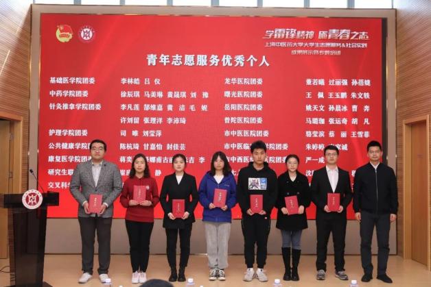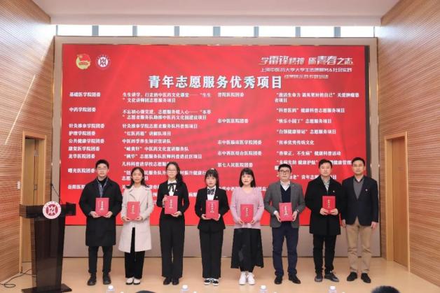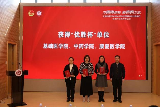 与会领导和嘉宾先后为青年志愿服务优秀个人和项目,暑期社会实践先进个人和优秀指导教师,暑期社会实践项目三等奖、二等奖、一等奖,“优胜杯”获得单位基础医学院、中药学院、康复医学院,以及“求实杯”获得单位护理学院颁奖。