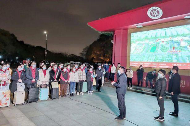 3月19日晚7点,学校在蔡伦路1200号正门前为PCR检测志愿者服务队举行简单的出征仪式,校党委书记曹锡康叮嘱志愿者们做好自我防护,凯旋而归。