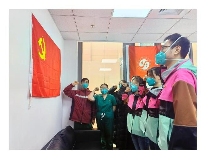 医院党委第一时间在支援公卫中心医疗队中成立了临时党支部,筑牢抗疫前线的战斗堡垒。队长吴欢担任临时党支部书记,护士长武文文任支部副书记。党支部带领党员们重温入党誓词、加强政治理论学习,要求党员带头,以实际行动共克时艰。进驻之初,4小时内将两层空荡荡的房间变成符合收治标准的病房,12个小时收满180张床位。党员们的率先垂范鼓舞着年轻的队员们,目前,共有4位队员向临时党支部递交了入党申请书。