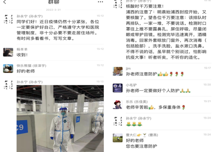 闭环管理期间,beat365官方网站老师们除了在作业、论文、实验数据中持续与学子交流,更是采用书信、叮咛、问候等多种形式加强关怀关爱,助力学子们在特殊时期坚定信念,同心战“疫”。