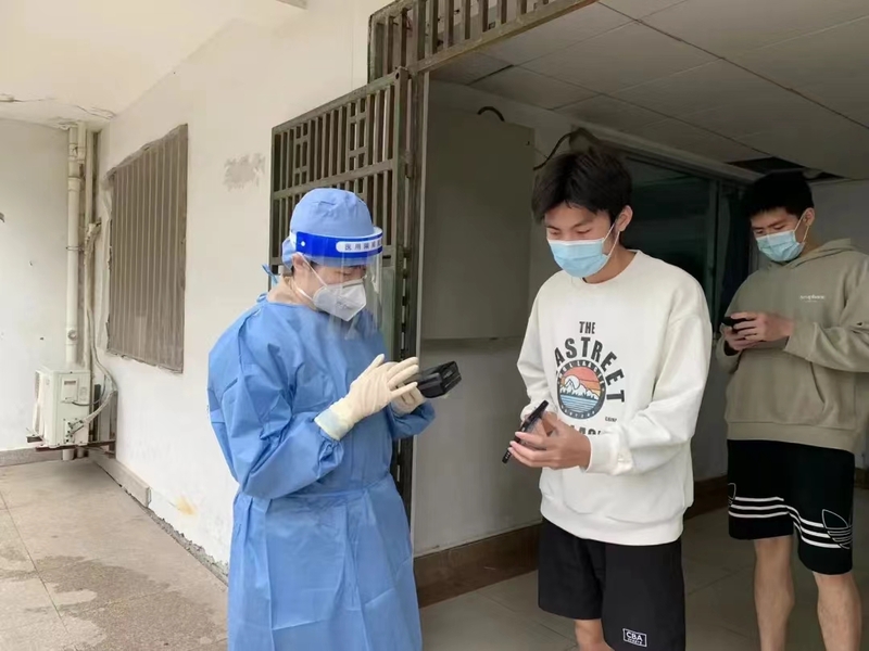 受到父母带动,唐婧奕看到社区群里的招募志愿者通知时就立刻报了名,利用在线教育课后时间,在居委采样点现场维持秩序、扫核酸码、协助医务人员采样、上门发放抗原采样物品。她说:“作为医学生,我义不容辞入队。”