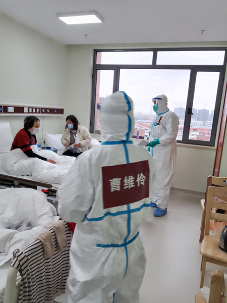 “脱下防护服,摘下口罩,走出隔离区,我们是娇小柔弱的女孩子;穿上‘白色战袍’,戴上护目镜,走进隔离区,我们就是救死扶伤的女汉子。”曹维伶说,“在这里,我们和患者的心挨得越来越近,大家互相扶持帮助,为早日战胜疫情一起努力!”