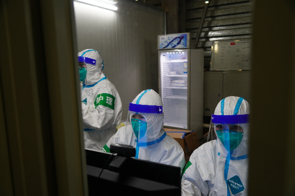 图说:一家大型方舱医院里,护士换上防护服,准备转运核酸样本 郜阳 摄