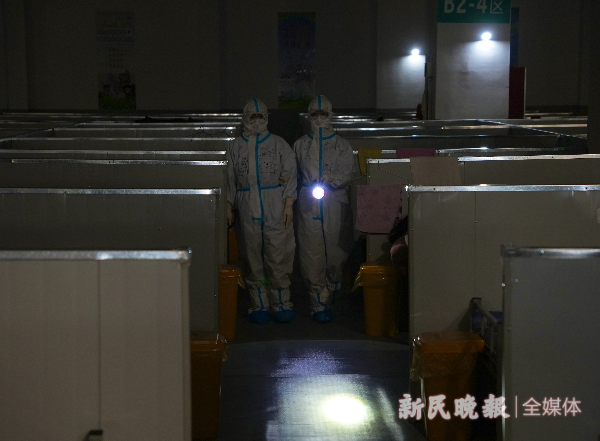 图说:黑暗中,方舱医院值夜班的护士打着手电筒巡视 新民晚报记者 刘歆 摄