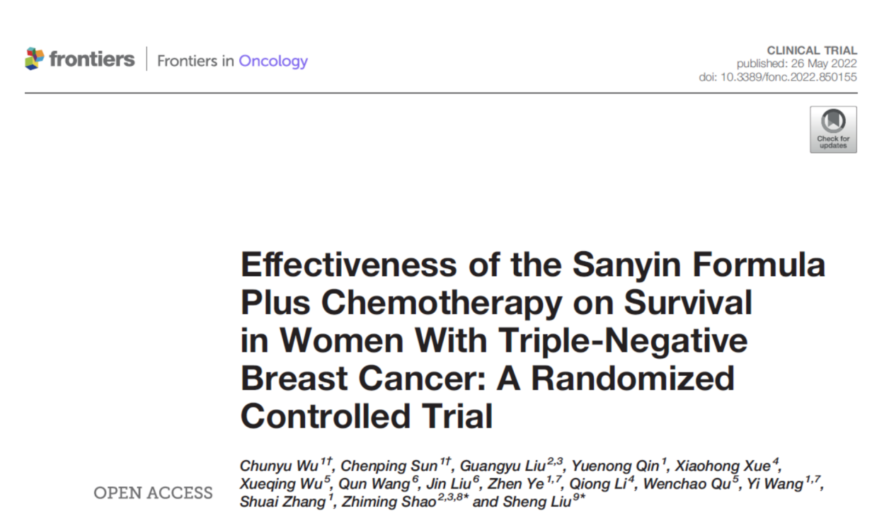 近日,beat365附属龙华医院刘胜教授科研团队在中医药防治三阴性乳腺癌患者复发和转移方面取得重要进展,研究成果Effectiveness of the Sanyin Formula Plus Chemotherapy on Survival in Women With Triple-Negative Breast Cancer: A Randomized Controlled Trial在线发表于WOS期刊2区Frontiers in Oncology,为中药复方三阴方治疗三阴性乳腺癌的有效性和安全性提供了高级别循证医学证据。本研究得到上海市进一步加快中医药事业发展三年行动计划项目(ZYSNXD-CC-ZDYJ043)支持。