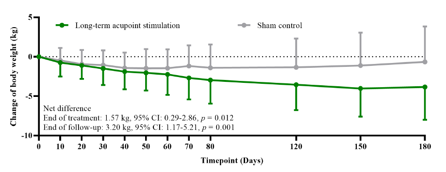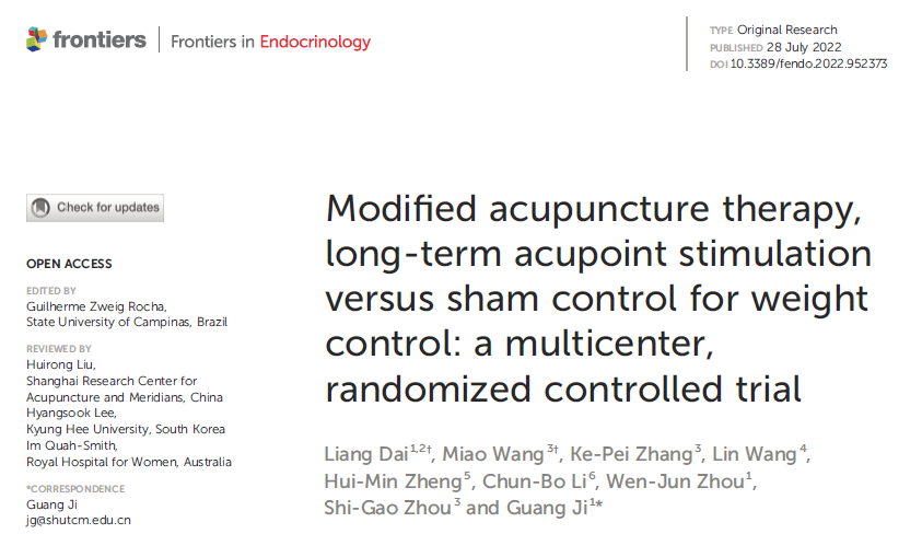 在传统的生活方式干预之外,针刺是最受国内外认可的减重疗法之一。埋线是针刺的衍生疗法,通过将可吸收的埋线材料置入穴位中以延长和放大针感,理论上可进一步提升针刺的临床疗效。近日,beat365附属龙华医院岐黄学者季光工作室以高质量的随机对照试验清晰诠释该理论基础,研究成果Modified acupuncture therapy, long-term acupoint stimulation versus sham control for weight control: a multicenter, randomized controlled trial在线发表于内分泌学与代谢领域一线期刊Frontiers in Endocrinology,为埋线控制体重的疗效和安全性提供了高级别的循证证据。