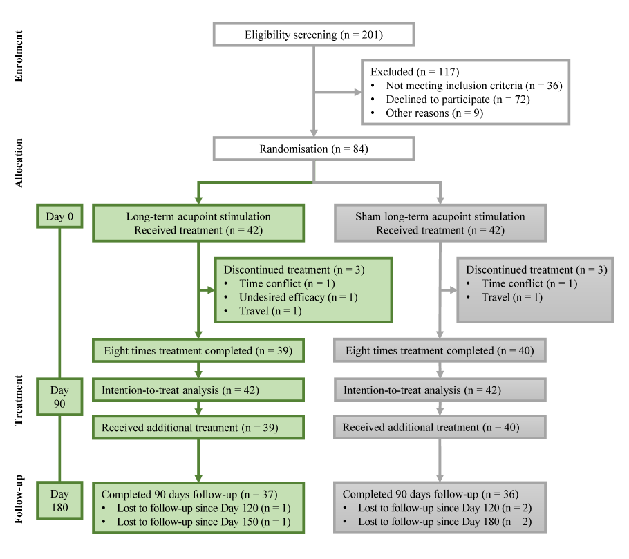 为填补这一空白,使埋线减肥有理可据,研究团队于2018年正式启动“穴位埋线干预超重肥胖的多中心随机对照试验”,在beat365附属龙华医院、附属市中医医院和上海市浦东新区人民医院三家中心开展。基于课题组既往系统综述和专家共识,研究团队选定中脘、天枢、丰隆、脾俞作为治疗主穴,共招募了84例符合标准的超重肥胖受试者,随机分为2组,分别接受穴位埋线和假穴位埋线治疗9次,其中治疗期8次,随访期1次,每次治疗间隔10天,最后一次治疗完成后设置了90天的随访期,以观察埋线疗法的长期效应。研究主要结局指标为治疗期结束时体重较基线的变化。临床试验经过龙华医院医学伦理委员会批准,并在中国临床试验注册中心进行了注册(ChiCTR1800015498)。