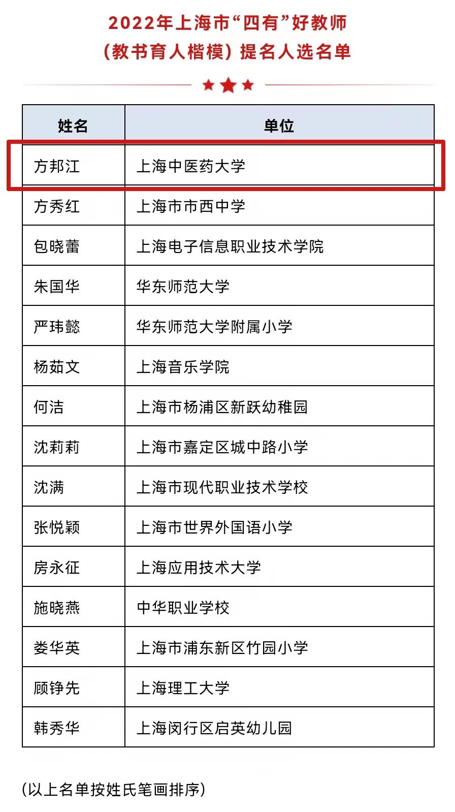 beat365方邦江教授入围2022年上海市“四有”好教师(教书育人楷模)提名人选名单