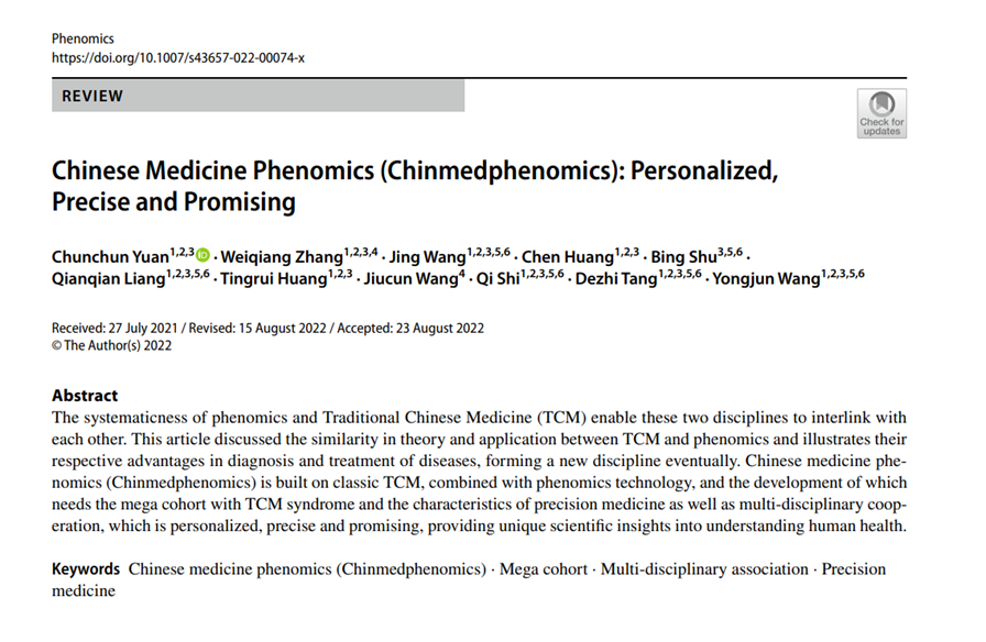 国医大师施杞、王拥军教授和唐德志教授带领团队在Phenomics刊文,推动建立中医表型组学