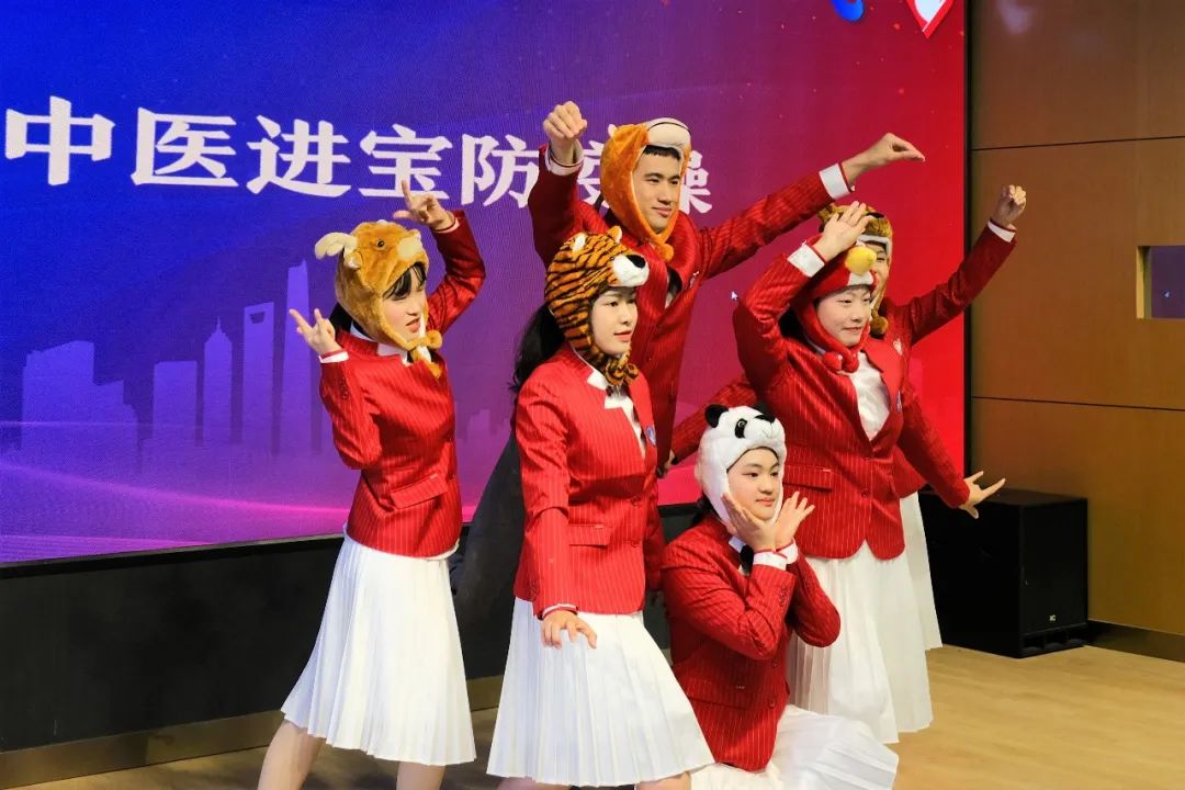 启动仪式上,经过创意升级的中医进宝防疫操再次闪亮登场。为了与进博会吉祥物“进宝”熊猫相呼应,“小叶子”志愿者们头戴五禽戏中虎、鹿、熊、猿、鸟的帽子,化身中医“进宝”,将传统保健功法五禽戏与现代流行舞蹈元素相融合,在舞出杏林学子蓬勃向上的精神面貌的同时也起到强身健体的作用,为“小叶子”筑起防疫健康屏障,向全世界展现中医药文化的独特魅力。