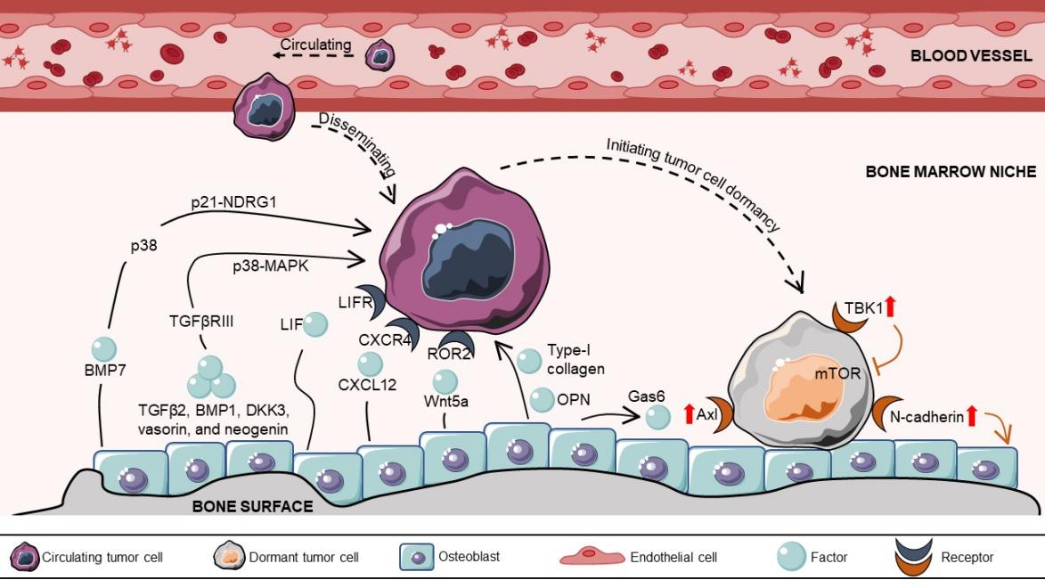 肿瘤转移是一个复杂且漫长的过程,由于骨髓中丰富的营养物质,绝大部分的播散肿瘤细胞(Disseminated tumour cells, DTCs)都有向骨转移的倾向。为了适应骨表面恶劣的生理条件和复杂的骨微环境,大部分转移到骨的DTCs会选择进入肿瘤休眠(Tumour cell dormancy)的状态。在这个过程中,维持骨稳态的两种重要的细胞:成骨细胞(Osteoblasts)和破骨细胞(Osteoclasts)起到关键调控作用。研究发现,成骨细胞调控的骨形成(Bone formation)可以与肿瘤细胞直接结合来诱导DTCs进入休眠,也可以通过释放各种生长因子(如OPN,Gas6,BMP7,Wnt5a等)来维持DTCs的肿瘤细胞休眠状态(图2)。