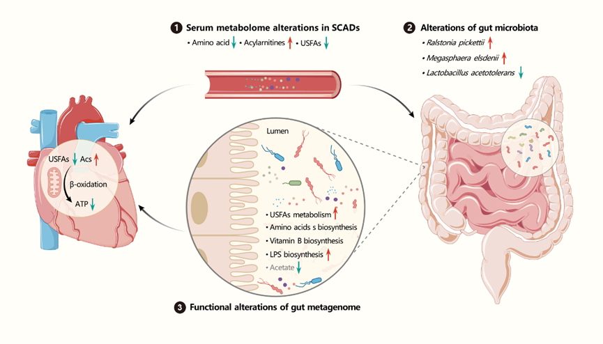 心脑血管疾病是导致人类死亡的主要疾病之一。既往研究表明,肠道菌群失衡与冠心病之间存在密切的关系,但是,临床稳定性冠心病心绞痛患者的肠道菌群与机体代谢特征尚不完全清楚。研究团队利用宏基因组学与靶向定量代谢组学技术描绘了SCAD患者肠道菌群的变化特征及血清代谢物谱。研究显示,SCAD患者的肠道菌群α多样性显著降低,29种肠道菌的丰度显著变化,并伴随着氨基酸、B族维生素代谢和脂多糖(LPS)合成功能的失调,首次发现Ralstonia Pickettii是SCAD患者肠道微生物功能稳态失衡的核心菌株。同时,代谢组学结果表明SCAD患者体内的氨基酸、脂肪酸和肉碱水平明显失衡,其中以不饱和脂肪酸水平(unsaturated fatty acids, USFAs)的降低最为显著,进一步的相关性分析显示USFAs水平的降低与患者肠道Ralstonia Pickettii的富集高度相关。利用体外细菌培养实验,发现Ralstonia Pickettii菌能够代谢消耗USFAs,提示SCAD患者体内USFAs下降可能与Ralstonia Pickettii菌增多有关。此外,基于随机森林分析获得了一组可能用于SCAD诊断的特征肠道菌群组合(疾病诊断能力达到AUC=0.91)。该研究不仅描绘了SCAD患者体内代谢与肠道菌群的特征性变化,而且首次发现了SCAD患者肠道中富集的Ralstonia Pickettii可能是患者体内USFAs降低的重要原因,为从肠道菌群的角度认识SCAD形成的机制提供了新证据。