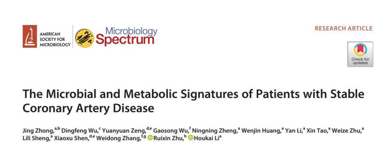 近日,中药学院李后开教授团队在临床稳定性冠心病心绞痛患者(stable coronary artery disease,SCAD)的特征肠道菌群与代谢物谱变化研究中取得进展,相关研究成果在美国微生物学会旗下的微生物学专业期刊《微生物谱》(Microbiology Spectrum)发表题为The Microbial and Metabolic Signatures of Patients with Stable Coronary Artery Disease的研究性论文。