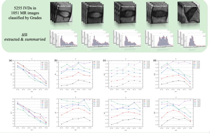 针对这一难题,该团队通过多学科交叉融合,率先开发出基于深度学习语义分割网络的椎间盘退变量化分析算法——BianqueNet。基于该算法极高的精准度,团队对全国4个城市共计1051例人群进行横断面研究,结果表明椎间盘内信号差异与椎间盘退变等级显著相关;再结合对不同人群基线特征(年龄、性别、椎间盘节段)构建不同椎间盘退变等级的参量标准,从而实现不同人群的精准化椎间盘退变自动量化评估,对椎间盘表观遗传学及经筋失衡研究具有很重要的指导价值。