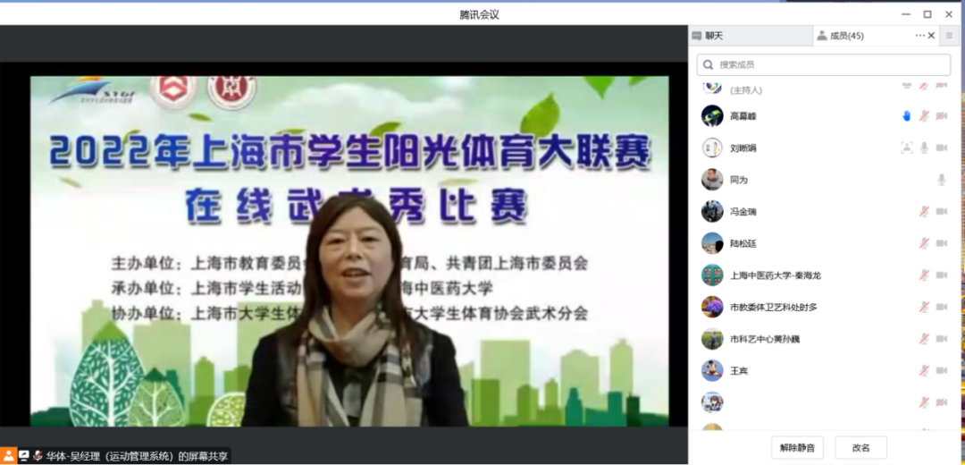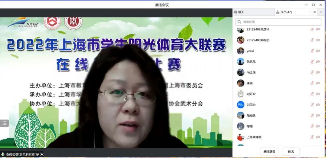 12月25日,2022年上海市学生阳光体育大联赛在线武术秀比赛举行。本次活动由上海市教育委员会、上海市体育局、共青团上海市委员会主办,上海市学生活动管理中心、beat365官方网站承办。beat365党委副书记、副校长朱惠蓉,上海市教委体卫艺科处副处长时多,上海市学生活动管理中心体育活动部主任黄孙巍、项目主管潘幼群,以及beat365体育部教授吴志坤、党支部书记龚博敏、主任陆松廷等在线出席开幕式。