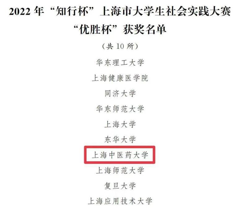其中,护理学院《传国粹·润童心·践使命——中医药文化赋能成长,社会实践助力“双减”》获市级特等奖;公共健康学院《“疫”线有我,“青”力相助——上海市浦东新区新冠疫情流调志愿者服务实践》、针灸推拿学院《点亮眼睛,守护“瞳”真——“双减”政策下青少年用眼健康的多位科普》、基础医学院《百年中药老字号的守与创——海派炮制特色技艺的传承与发展调研》获二等奖;国际教育学院《情系中医文博,讲好中国故事——上海中医药博物馆文物传承与守护》、校团委《把脉公众急救,守护生命黄金期——改善公众急救普及的对策调研》、康复医学院《远距离,近关照——脑卒中远程居家康复指导》获三等奖。李媛、夏勇、董志颖、宋花玲、杨莹获评为“优秀指导教师”,护理学院学生李雅雯、针灸推拿学院学生贾雯棋获评为“先进个人”。