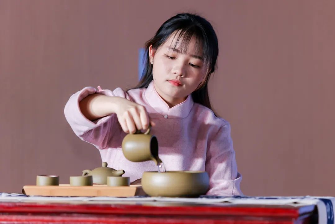 “茗赏者上也”,《礼仪中国》表演展现了茶艺、书法艺术的墨香茶韵,现场师生在欣赏艺术的同时受到潜移默化的文化熏陶。