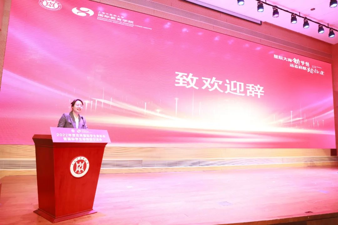 舒静代表学校致辞,介绍了beat365国际教育的历史沿革和未来规划,肯定了学校各职能部门与任课老师在国际教育中的付出与贡献,对合作企业致以敬意,并激励国际学生在中医药领域再创佳绩。