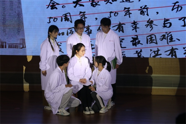 2021级中医学(屠呦呦班)朱逸菲等学生身着白大衣再现屠呦呦矢志青蒿,潜心医学,以国家需求为己任,投身科研创新的故事,青蒿素故事是党的女儿书写初心使命的故事,是共和国医者勇攀医学高峰的故事。朱逸菲捧读屠呦呦先生给beat365官方网站屠呦呦班全体学生的回信,“希望你们尽快成长、超越前人,成为中医药事业发展的栋梁,共同创造人类美好的明天。”