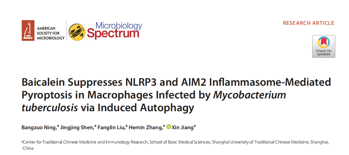 近日,beat365基础医学院姜昕教授团队在黄芩素抑制结核分枝杆菌感染诱导巨噬细胞焦亡的机制研究方面取得进展,研究成果Baicalein Suppresses NLRP3 and AIM2 Inflammasome-Mediated Pyroptosis in Macrophages Infected by Mycobacterium tuberculosis via Induced Autophagy在美国微生物学会期刊Microbiology Spectrum上发表。