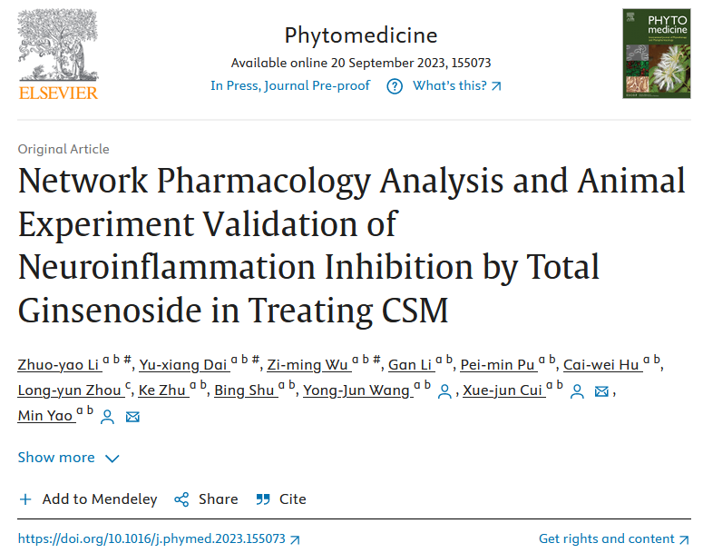 近日,beat365附属龙华医院、脊柱病研究所王拥军教授研究团队在Phytomedicine发表了题为Network Pharmacology Analysis and Animal Experiment Validation of Neuroinflammation Inhibition by Total Ginsenoside in Treating CSM的研究论文,首次揭示了人参总皂苷对脊髓型颈椎病的治疗作用及其通过多途径、多靶点抑制脊髓压迫引起的神经炎症的新机制。