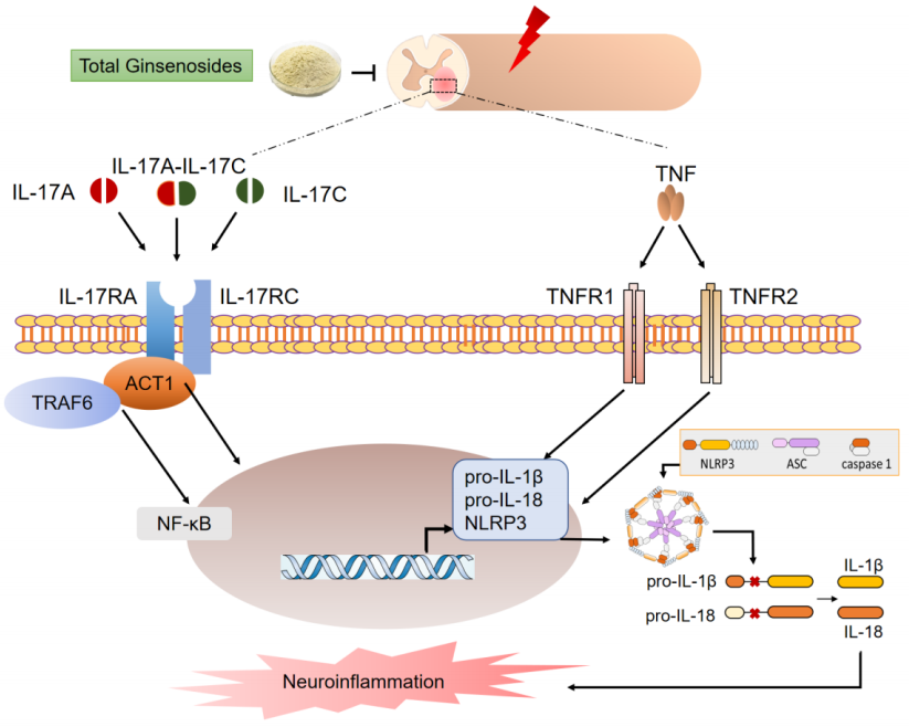 该研究首先采用UPLC-Q-TOF-MS对人参总皂苷样品进行质谱分析,再利用网络药理学方法确定人参总皂苷治疗CSM的潜在机制,最后在体内实验验证人参总皂苷对CSM大鼠的疗效和作用机制。该研究发现人参总皂苷可以恢复CSM大鼠的运动功能,并通过调控TNF、IL-17、TLR4/MyD88/NF-κB、MAPK等信号通路,降低NF-κB的磷酸化和NLRP3炎症小体的激活,从而减轻神经炎症。该研究体现了中药活性成分在体内多途径、多靶点的作用特点,为后续CSM的临床研究和药物开发提供依据。