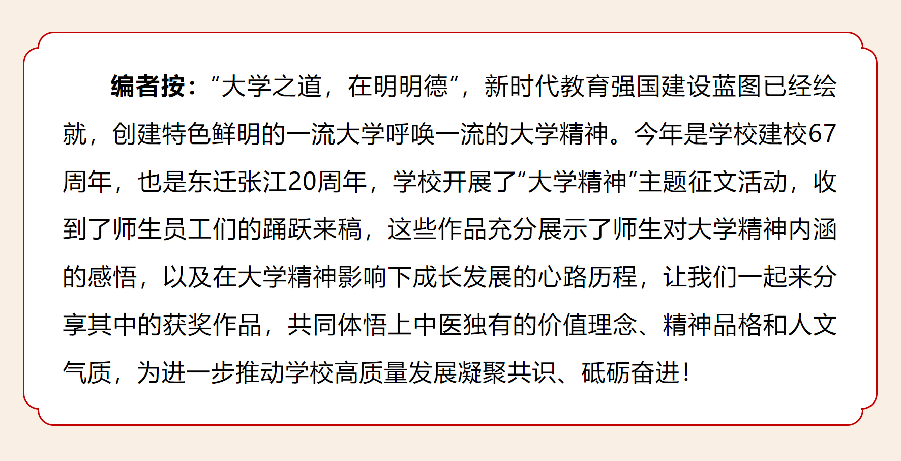 →“大学精神”主题征文获奖作品展示⑥韩榕:上中医,读懂你内心的光——记在后勤的小时光 & 汪泳涛:大学精神