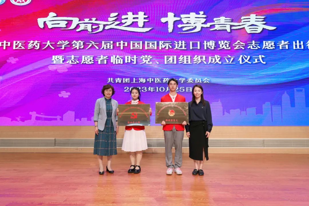 校党委组织部、校团委负责人为第六届进博会志愿者临时党、团组织授牌,希望临时党、团组织充分发挥战斗堡垒作用,激励党员志愿者发挥先锋模范作用、团员志愿者发挥突击队作用。