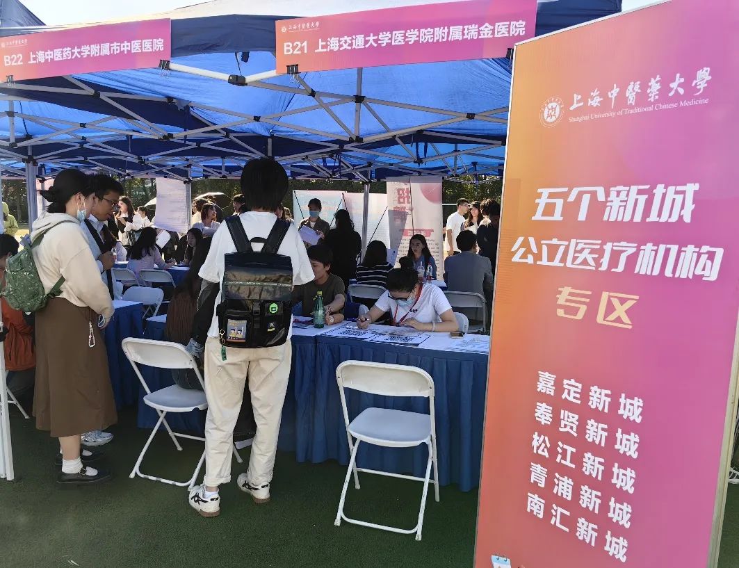 招聘会现场,最热门的区域是上海市“五个新城”公立医疗机构专区。嘉定、松江、青浦、奉贤、南汇“五个新城”的30余家公立医院一字排开,它们带来的招聘岗位以康复科、内科等为主,学历要求为医师类硕士研究生及以上,医技类本科及以上。奉贤区四团镇平安社区卫生服务中心党支部书记、副主任王瑛向上中医毕业生介绍,医院位于浦东新区与奉贤区交界处,这几年随着临港新片区的产业发展,特别是特斯拉、三一重工等大型企业的落户,大量企业员工和家属入住,成为社区卫生中心新的服务对象:“我们不仅急需康复科医师,还要招聘儿科、妇科等专业的人才。”招聘会现场,上中医护理学专业2024届毕业生潘怀瑜在“五个新城”专区投出了10份简历,她表示,对于职业生涯刚刚起步的应届毕业生来说,新城在薪资、落户、住房等方面的人才政策利好很有吸引力。