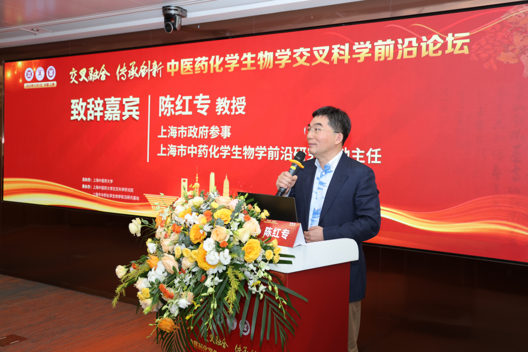 论坛开幕式由beat365官方网站交叉科学研究院常务副院长葛广波主持。陈红专致辞,介绍上海市中药化学生物学前沿研究基地自2021年成立以来的发展状况,并肯定战略合作、协同发展的院校合作模式带来的积极成效。林国强发表线上致辞,对上海市中药化学生物学前沿研究基地在多学科的交叉融合、中医药的传承创新、学生及青年教师的培养、成果的表达和转化等方面予以肯定,并预祝本次论坛取得圆满成功。