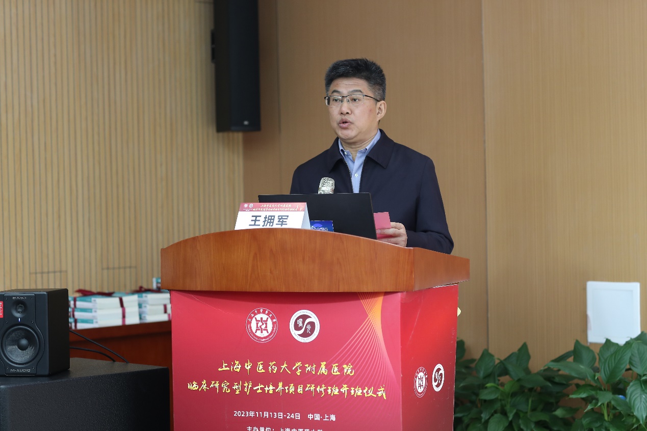 副校长王拥军、曙光医院党委书记周强峰、护理学院党总支副书记陈正芹、上海市护理学会副秘书长许方蕾、曙光医院临床研究中心常务副主任(GCP中心主任)元唯安、各附属医院护理部主任出席开班仪式。九家附属医院的20名临床研究型护士培养对象,及护理学院优秀专硕研究生代表参会。开班仪式由医院管理处处长陈昕琳主持。