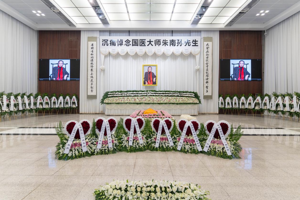 26日上午,龙华殡仪馆大厅内庄严肃穆,哀乐低回,哀思绵绵。大厅上方悬挂“沉痛悼念国医大师朱南孙先生”黑底白字横幅,横幅下方是朱南孙同志遗像,两侧悬挂挽联“大医无秘方,从合守变,彰显女科圣手;名师有仁术,博施济众,无愧送子观音”。大厅四周陈列着各界人士敬献的花圈,朱南孙同志的遗体安卧在鲜花翠柏丛中。