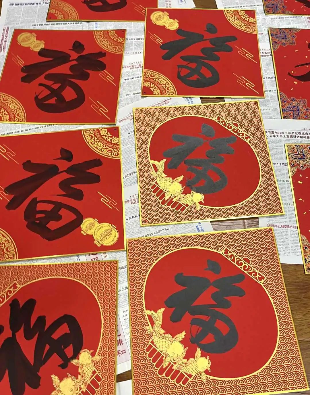 写春联、福字,是一种充满浓郁中国风的文化艺术活动,承载着中华民族的文化情感、民族记忆和美好希望。陆文耀启动“翰墨迎新”书法撰写活动。高壁为师生们讲解握笔和运笔的方法,并现场示范书写“福”和“龙”,用浓墨倾情为师生们送上新春祝福。应逸翔抽取三名幸运观众,根据他们的名字创作个性对联,“张灯结彩金龙来,聪颖聪慧财亨通”“花下化春三心归,木草龙马飞场来”“慧明慧觉慧春韵,珠光珠宝珠耀华”……这些红红火火的春联饱含美好的祝福,彰显着浓浓的喜庆氛围。