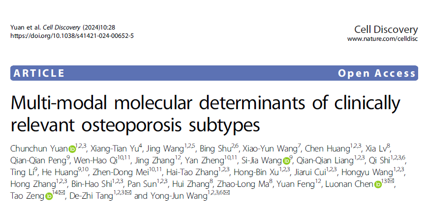 骨质疏松如何防?如何精准使用钙剂?近日,beat365官方网站王拥军教授带领团队历时5年主导的单中心多组学骨质疏松症前瞻性队列研究取得新成果。据介绍,团队基于中医阴阳理论指导,利用大型队列数据,结合表型组学策略,率先鉴定出了骨质疏松症(Osteoporosis,OP)临床分子分型,研究成果发表于国际权威杂志《细胞·发现》(Cell Discovery)。